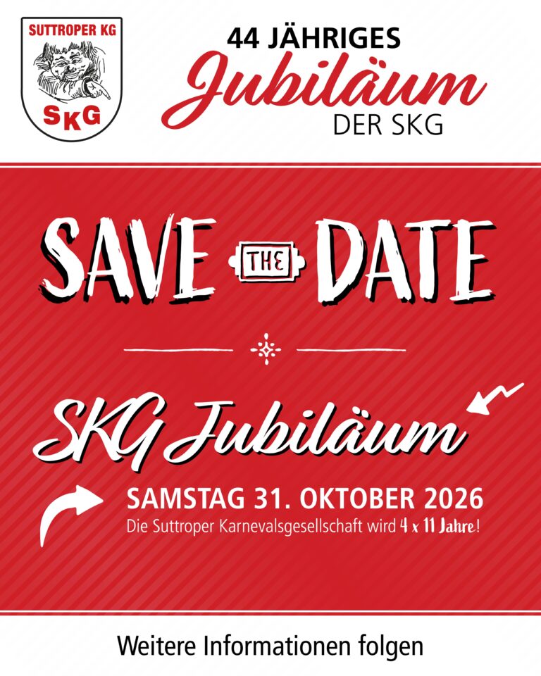 Am Freitag den 25.04.2025 findet um 20:00 Uhr die Generalversammlung der Suttroper Karnevalsgesellschaft im Gasthof Bültmann statt. Die Tagesordnungspunkte entnehmen Sie bitte der Einladung im Schaukasten der SKG (Johannesplatz), Social...